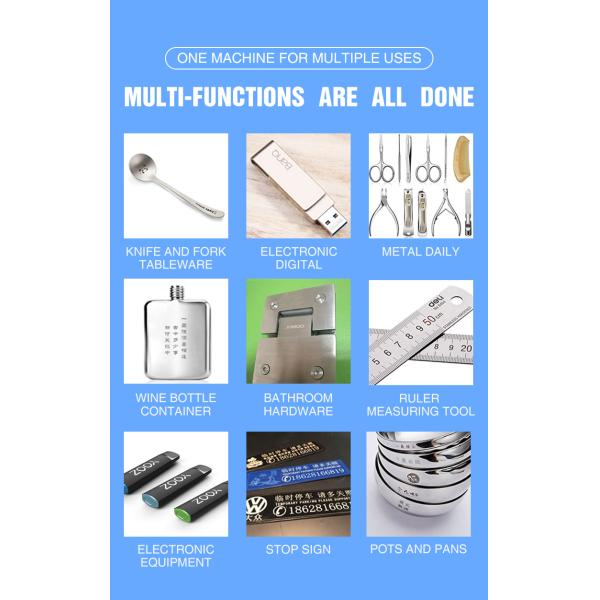 Metal: Stainless Steel, Carbon Steel, Alumina, Aluminum Alloy, Aluminum, Platinum, Tungsten, Titanium, Carbide Nickel, Brass, Copper, Iron, Gold, Silver, Cemented Carbide and other 95% metal materials can be marked on the surface/deep carving.
